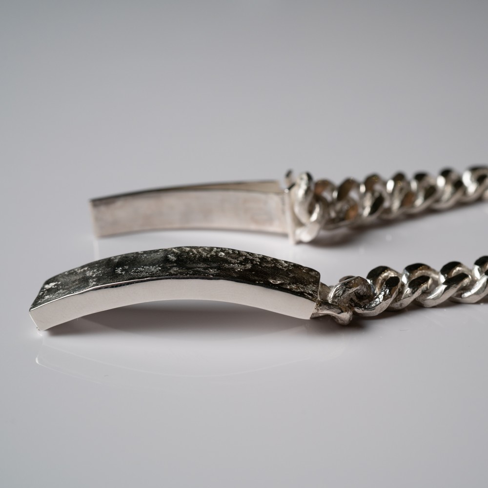 ハンマーフィニッシュされて、Rを付けたプレートと、クラシカルなチェーンは、他にはない奥行きのある表情。