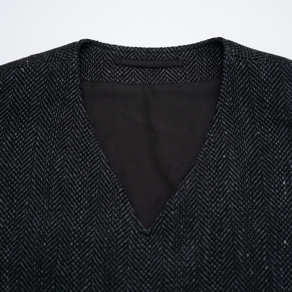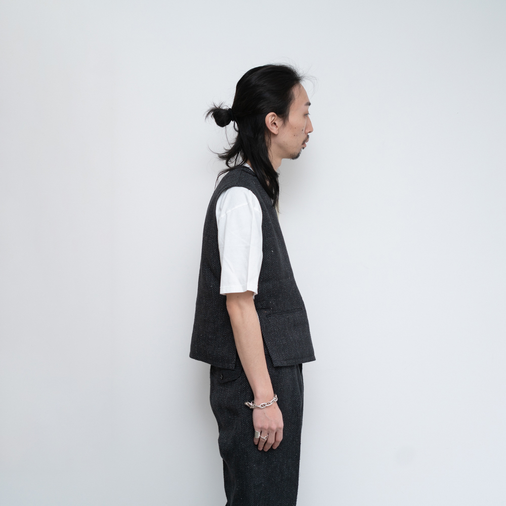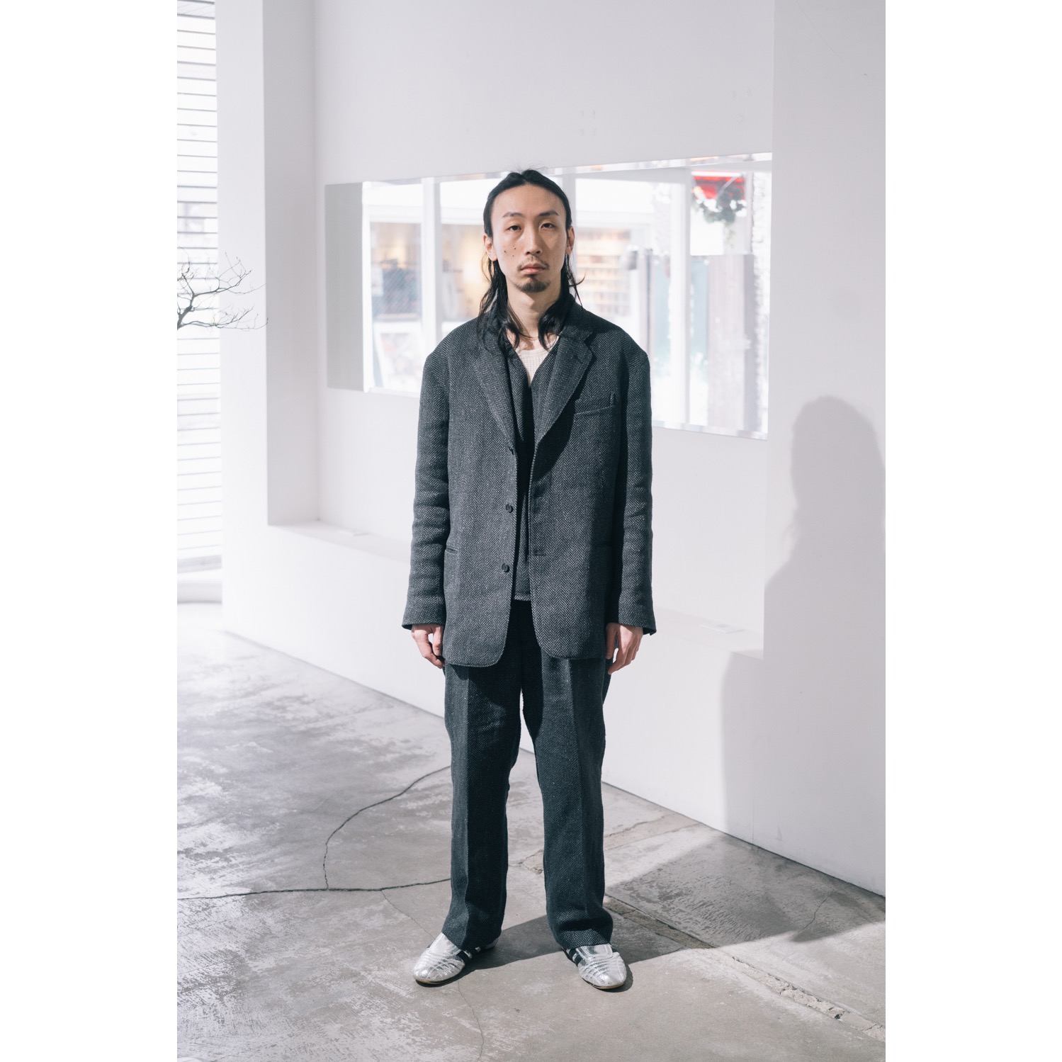 組織はヘリンボーンの間に別組織をいれた「IRREGULAR HERRINGBONE 」と組織はヘリンボーンをあえて歪ませた「FANCY HERRINGBONE 」の完全オリジナルで、紬糸のネップ、リネンの糸節といった天然素材ゆえの不均一性が程度な意匠効果を醸し出す。