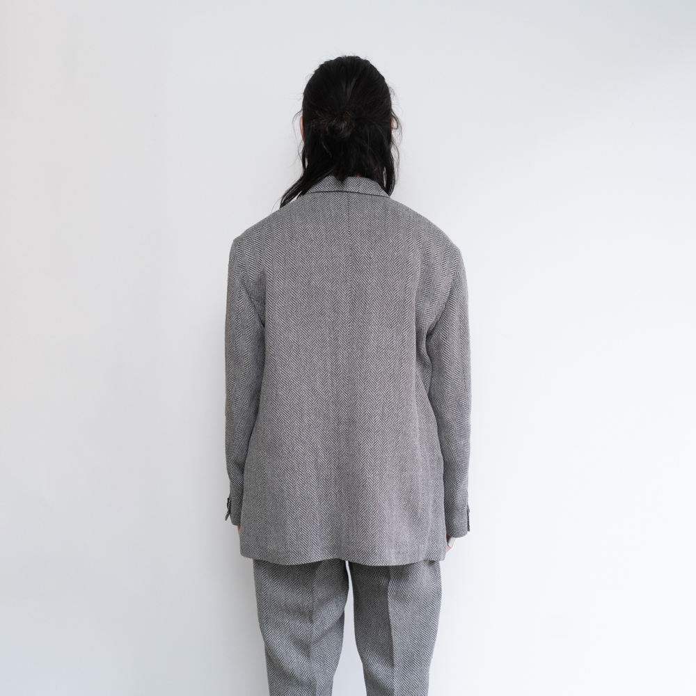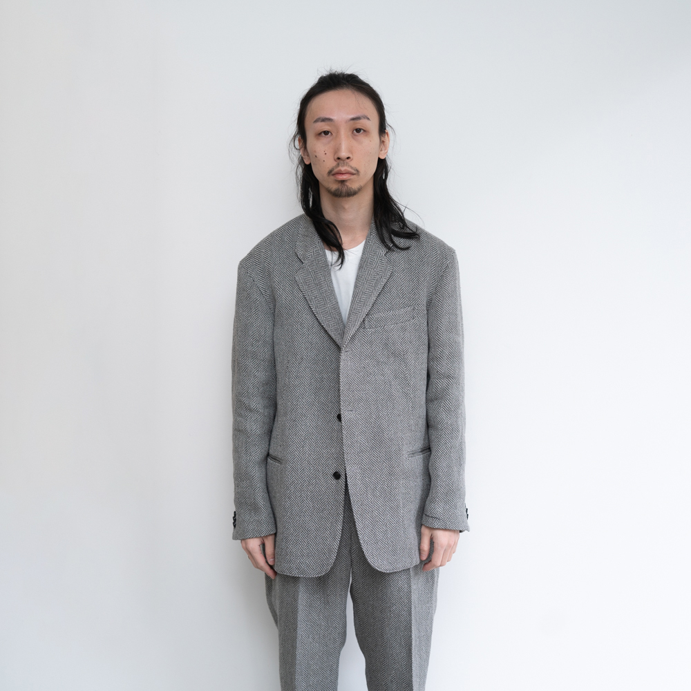 組織はヘリンボーンの間に別組織をいれた「IRREGULAR HERRINGBONE 」と組織はヘリンボーンをあえて歪ませた「FANCY HERRINGBONE 」の完全オリジナルで、紬糸のネップ、リネンの糸節といった天然素材ゆえの不均一性が程度な意匠効果を醸し出す。