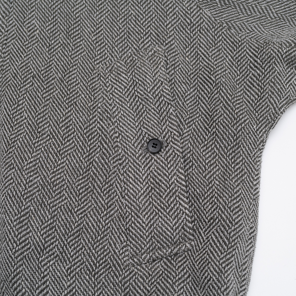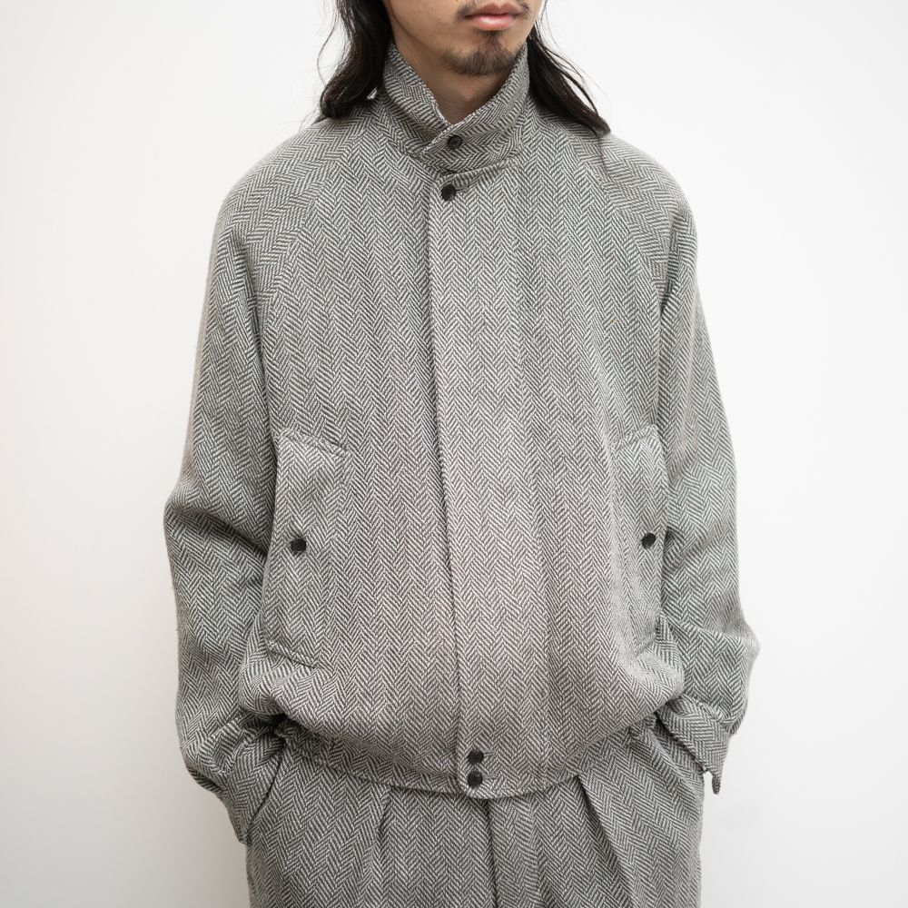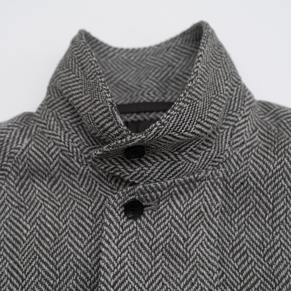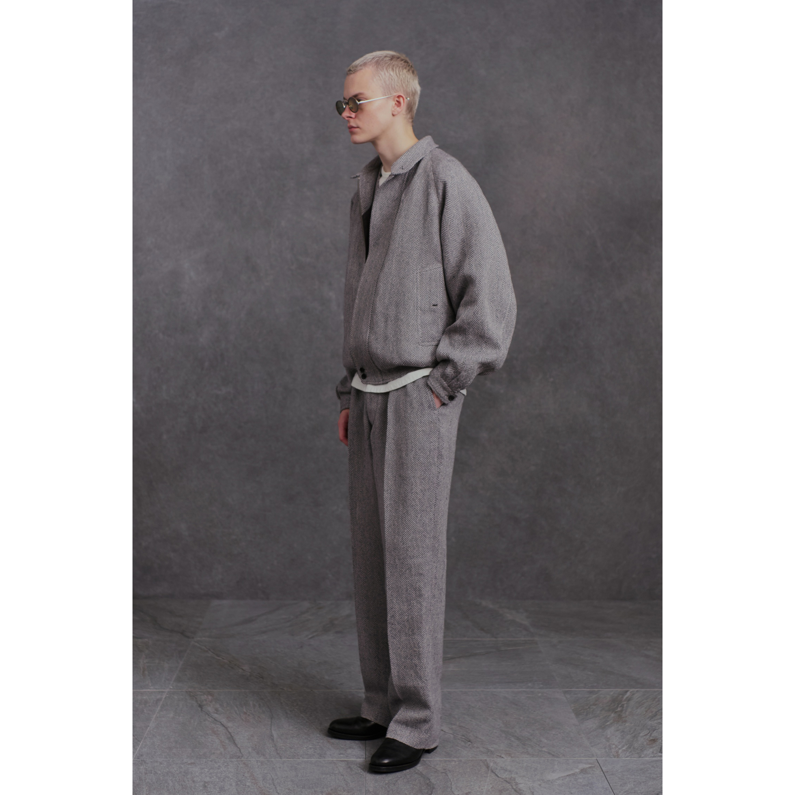 組織はヘリンボーンの間に別組織をいれた「IRREGULAR HERRINGBONE 」と組織はヘリンボーンをあえて歪ませた「FANCY HERRINGBONE 」の完全オリジナルで、紬糸のネップ、リネンの糸節といった天然素材ゆえの不均一性が程度な意匠効果を醸し出す。