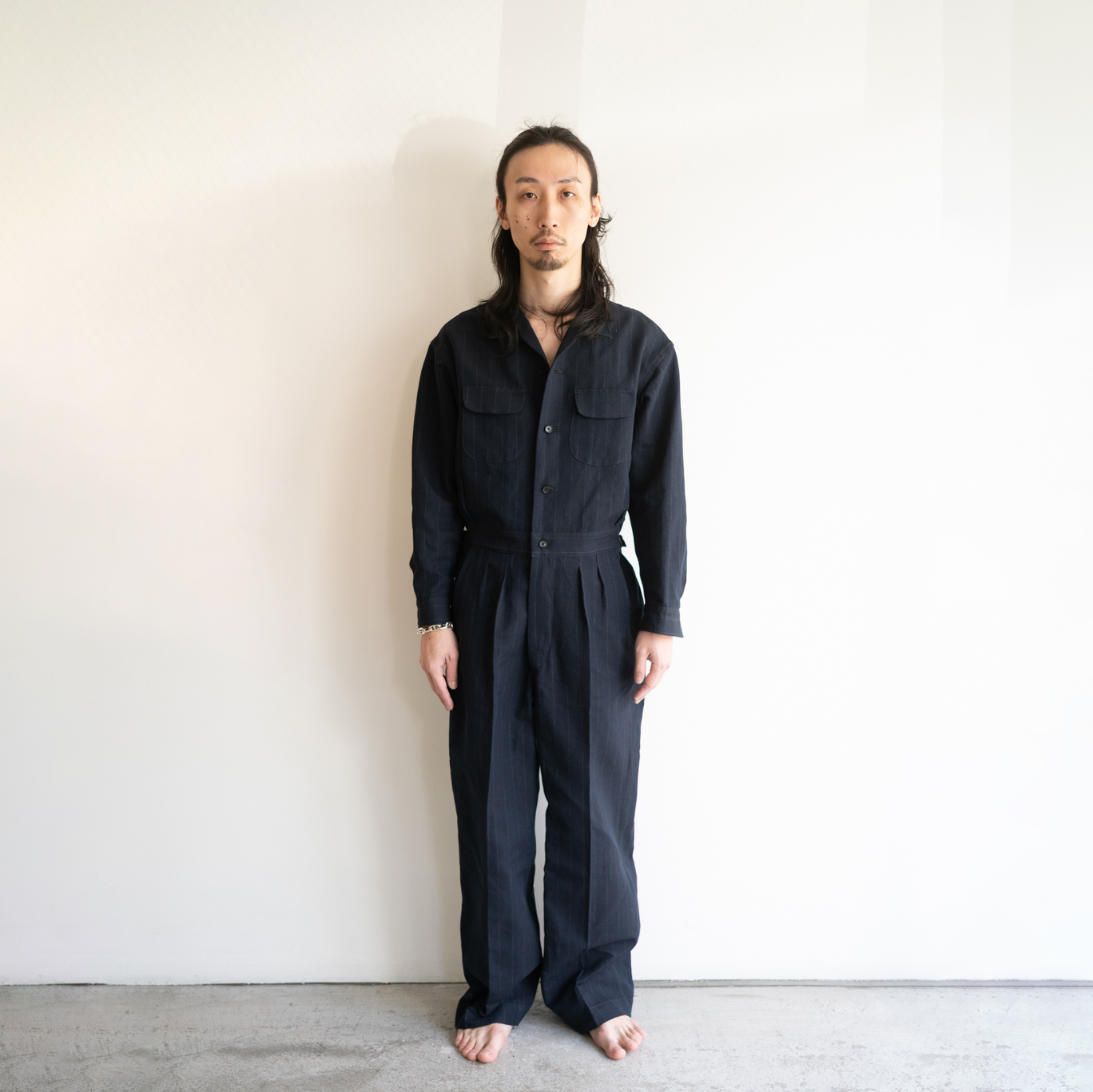 夏の装いに必要不可欠な開襟シャツとスラックスをドッキングさせたかのようなデザインが目を引きます。