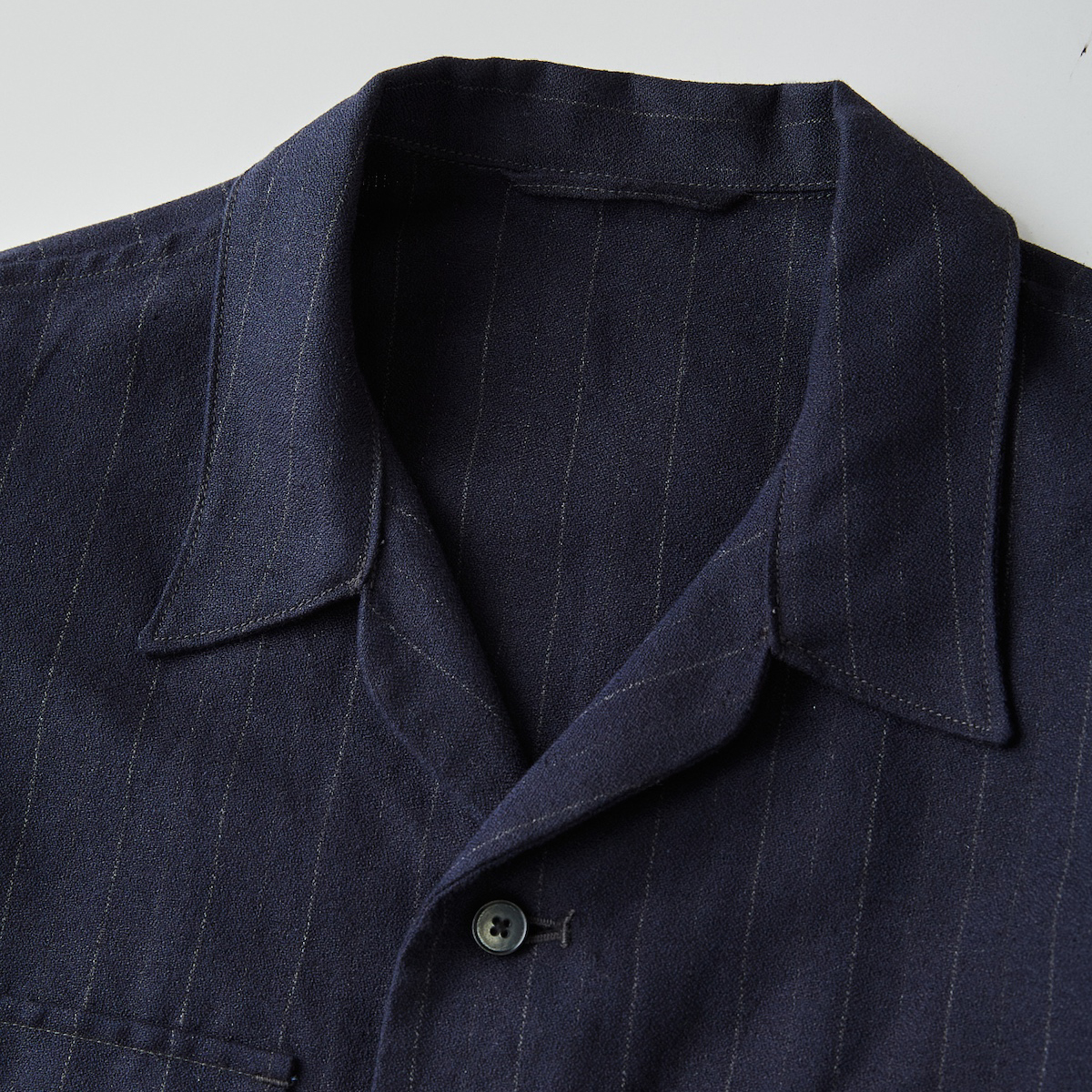 タテ糸にコットン、ヨコ糸にリネンを使用したアムンゼン。オリジナルの杢糸のストライプを入れよりエレガントな表情に。高密度に織り上げることで、細かい凹凸の中にしなやかさとドレープ感のある風合いが特徴。
