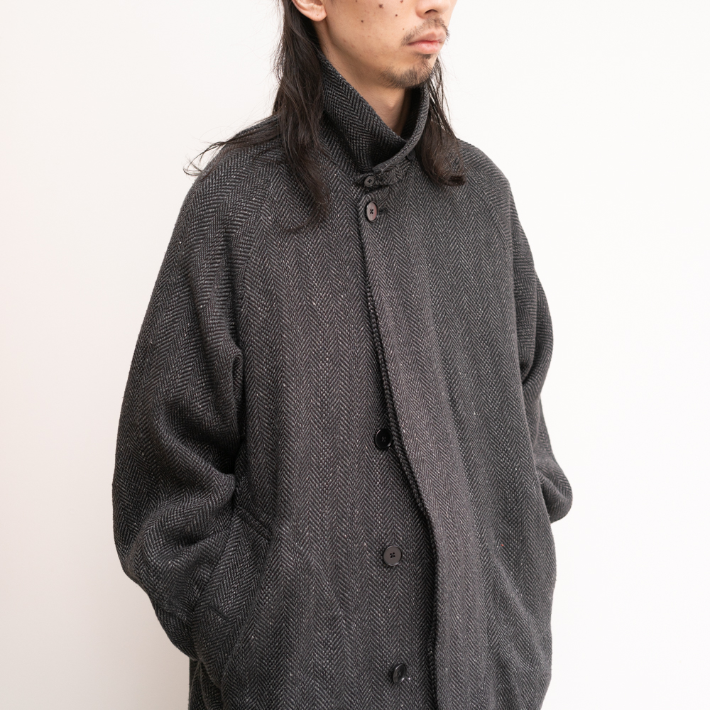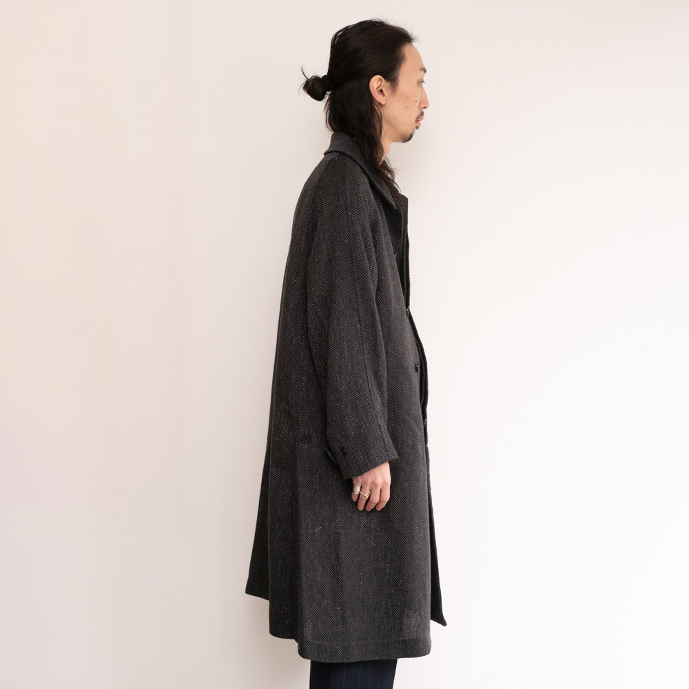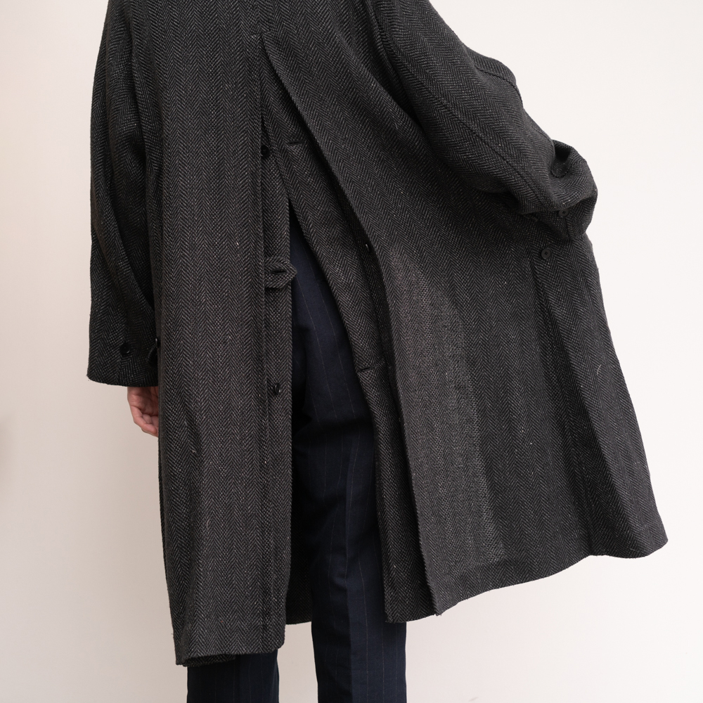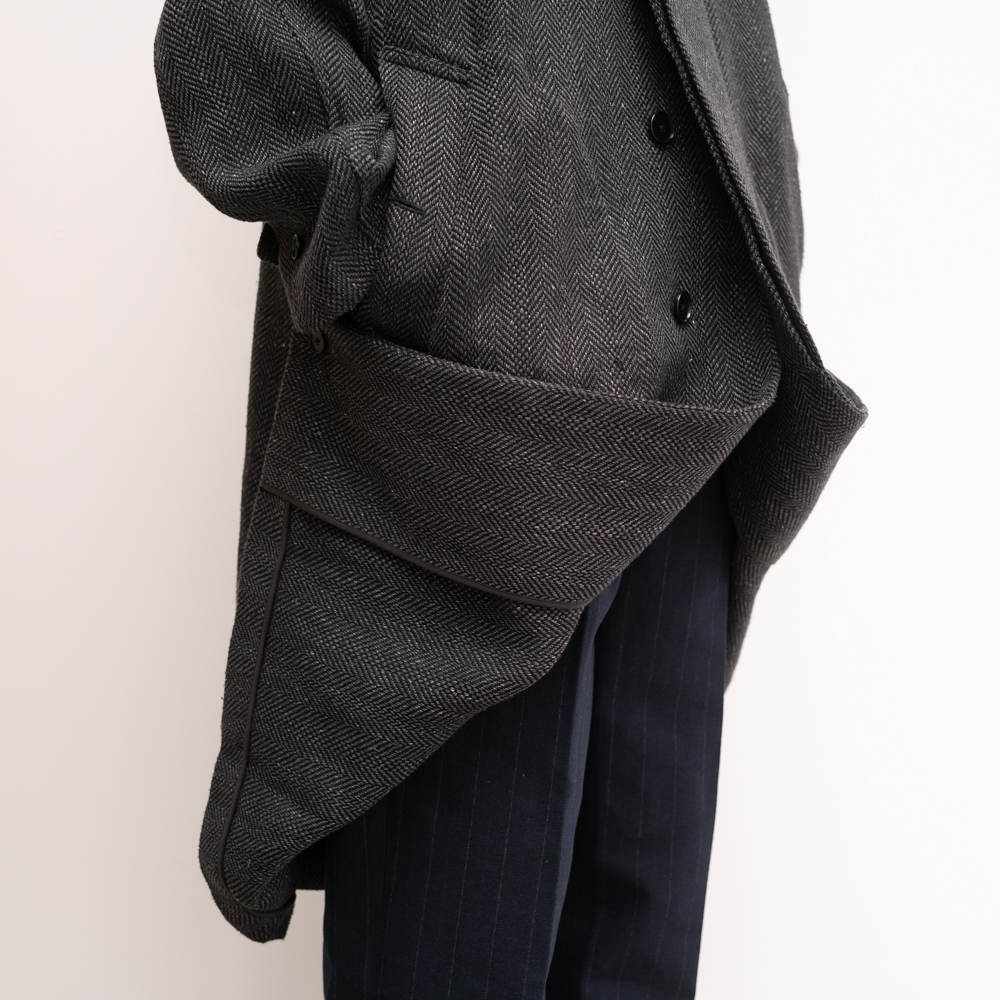 組織はヘリンボーンの間に別組織をいれた「IRREGULAR HERRINGBONE 」と組織はヘリンボーンをあえて歪ませた「FANCY HERRINGBONE」の完全オリジナルで、紬糸のネップ、リネンの糸節といった天然素材ゆえの不均一性が程度な意匠効果を醸し出す。