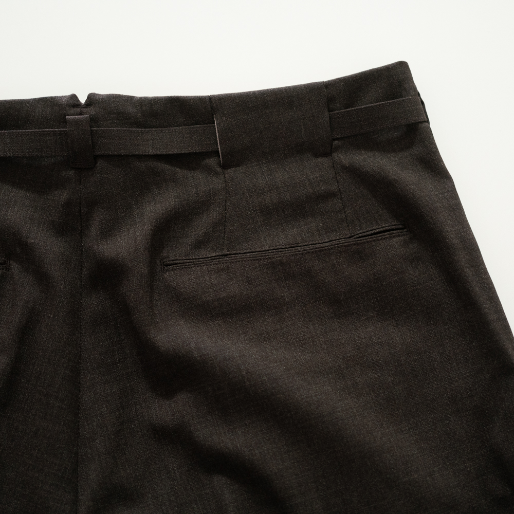 バックのダーツやポケット切り替えから続くベルトループ、フラットに見えるウエストはミニマルな印象。