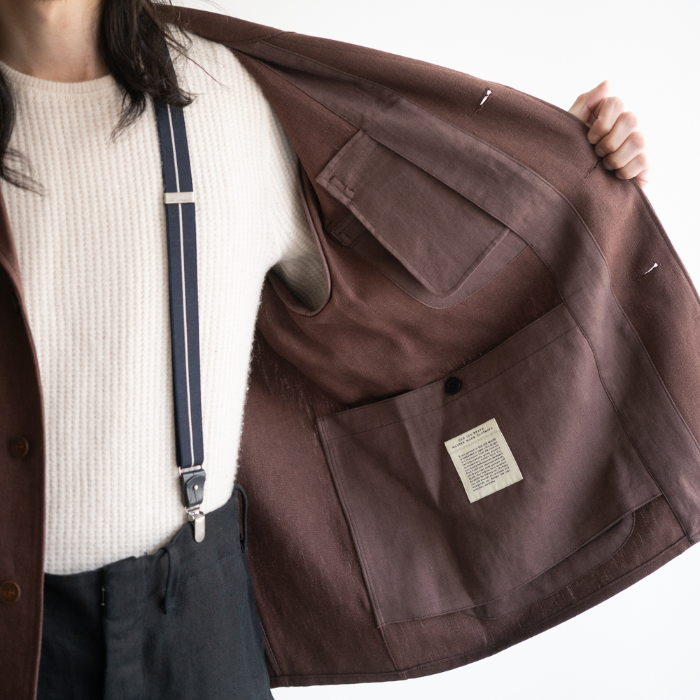 重厚感のあるマテリアルと古き良き時代のヨーロッパの作業着のデザインが最高の相性を見せる。