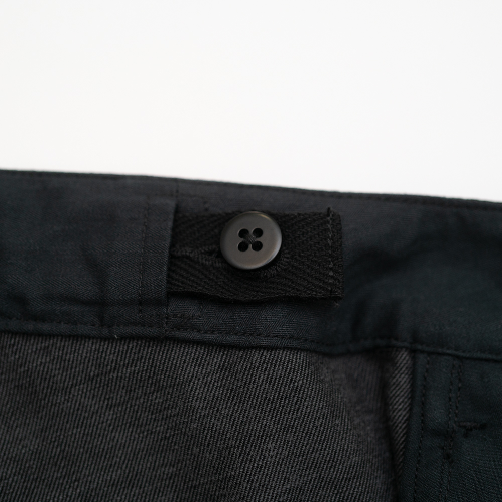 サイドシームと前たて内に配したダブルポケット、そしてウエストのフィッティングはエラスティックバンドを内蔵し、