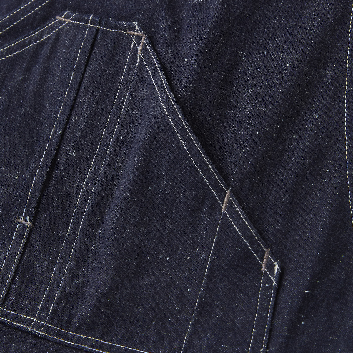 糸に拘り、オリジナルのデシネップを使用しています、 タテ糸は、デニム本来の素朴さやドライ感、バルキー感を表現するために繊維長の短めの綿も混ぜ込んで糸をつくりました。ヨコ糸は、米綿をメインにオーストラリア、ブラジル綿とブレンドし、安定した質感を目指し、また追燃することにより柔らかさの中にシャリ感をだしています。ロープ染色は黒味の強いインディゴ染料で染色し、深い色目を表現しています。 生地はいわゆるキバタと言われる織り上がった状態のものから、特殊な方法でサンフォライズ(防縮加工)のみをかけています。キバタの風合いを損なわず、表面の毛羽感も残しました。