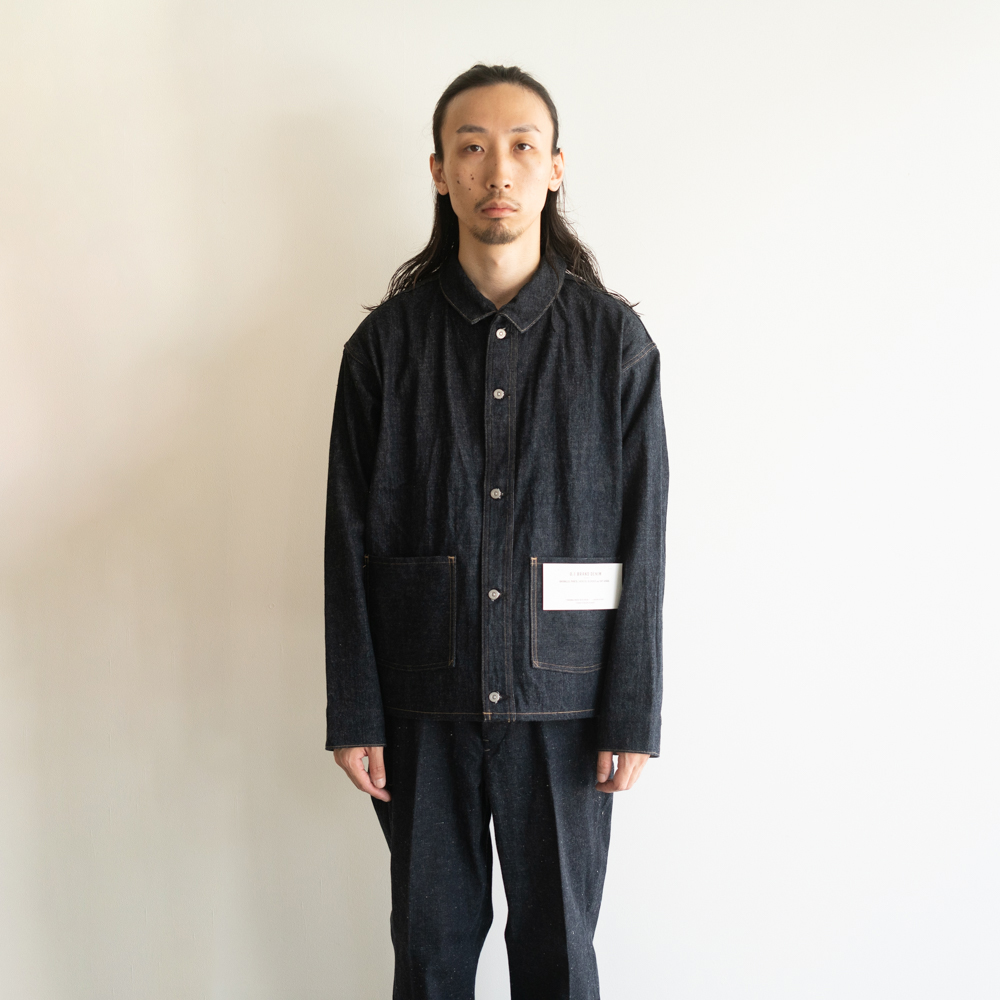 前立てのついたフロントに、見返し続きのアールを描いた一枚襟、シンプルな形のポケットはいわゆるなワークウェアの雰囲気とは違い、簡素でユニークな佇まいをしています。