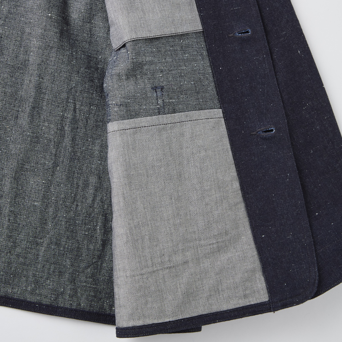 糸に拘り、オリジナルのデシネップを使用しています、 タテ糸は、デニム本来の素朴さやドライ感、バルキー感を表現するために繊維長の短めの綿も混ぜ込んで糸をつくりました。ヨコ糸は、米綿をメインにオーストラリア、ブラジル綿とブレンドし、安定した質感を目指し、また追燃することにより柔らかさの中にシャリ感をだしています。ロープ染色は黒味の強いインディゴ染料で染色し、深い色目を表現しています。 生地はいわゆるキバタと言われる織り上がった状態のものから、特殊な方法でサンフォライズ(防縮加工)のみをかけています。キバタの風合いを損なわず、表面の毛羽感も残しました。