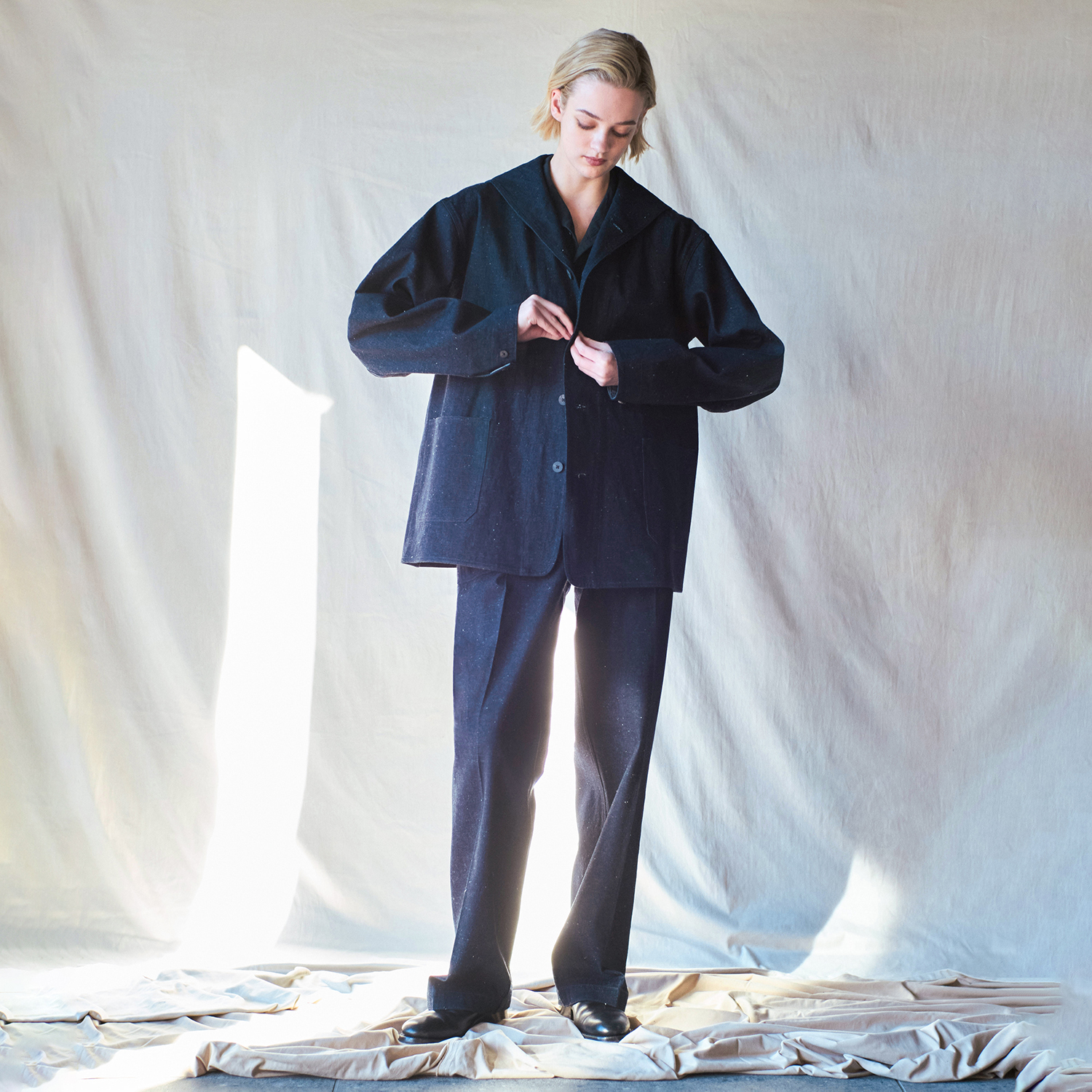 いわゆる水兵達のユニフォームの様な大袈裟なセーラーカラーとは違いショールカラーを変形させたかのような小振りな襟のデザインは、古い時代のアーカイブをベースに再構築されたオリジナルデザイン。