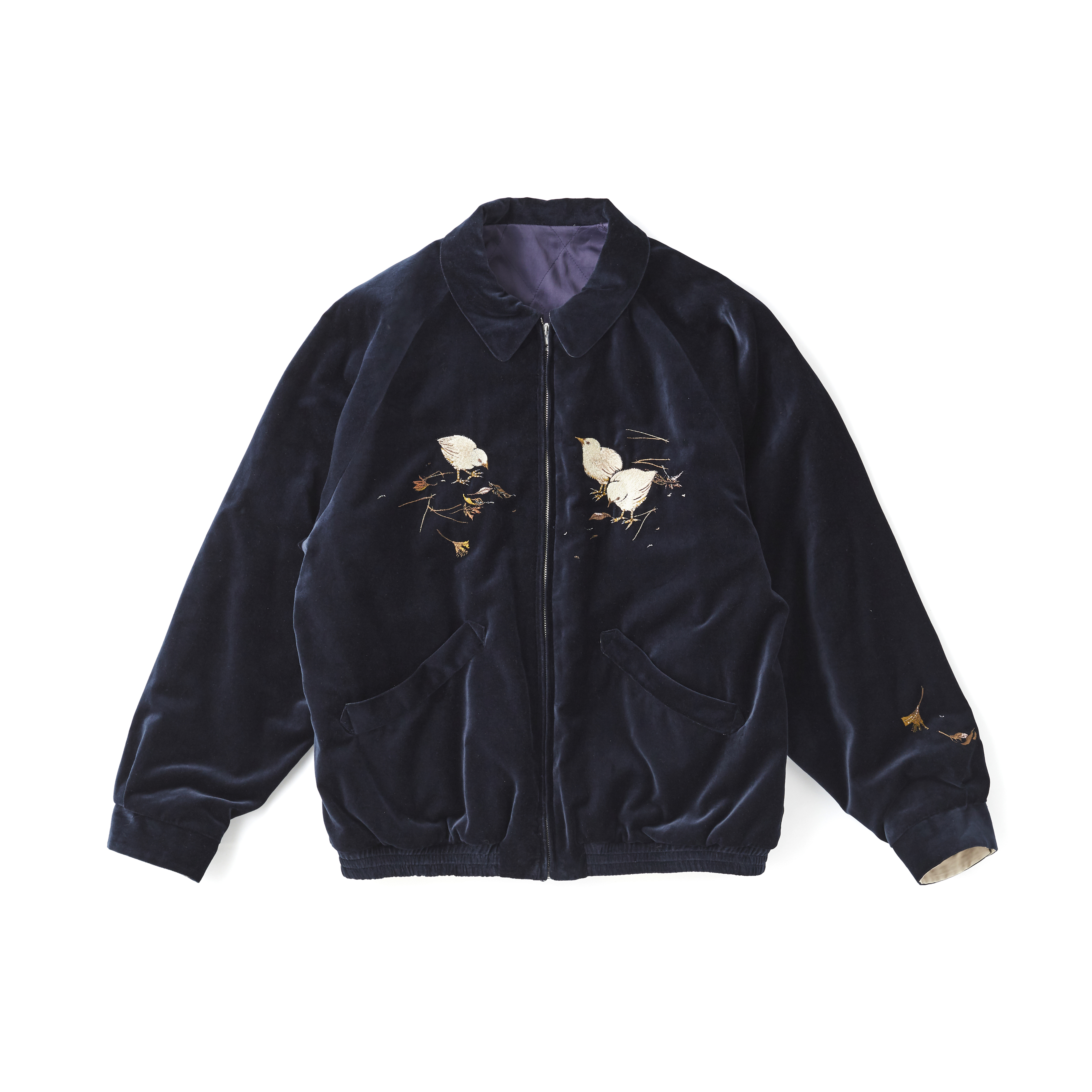 日本の伝統的なテクニックに倣い、古き良き美しい日本の風景を刺繍したジップブルゾン。