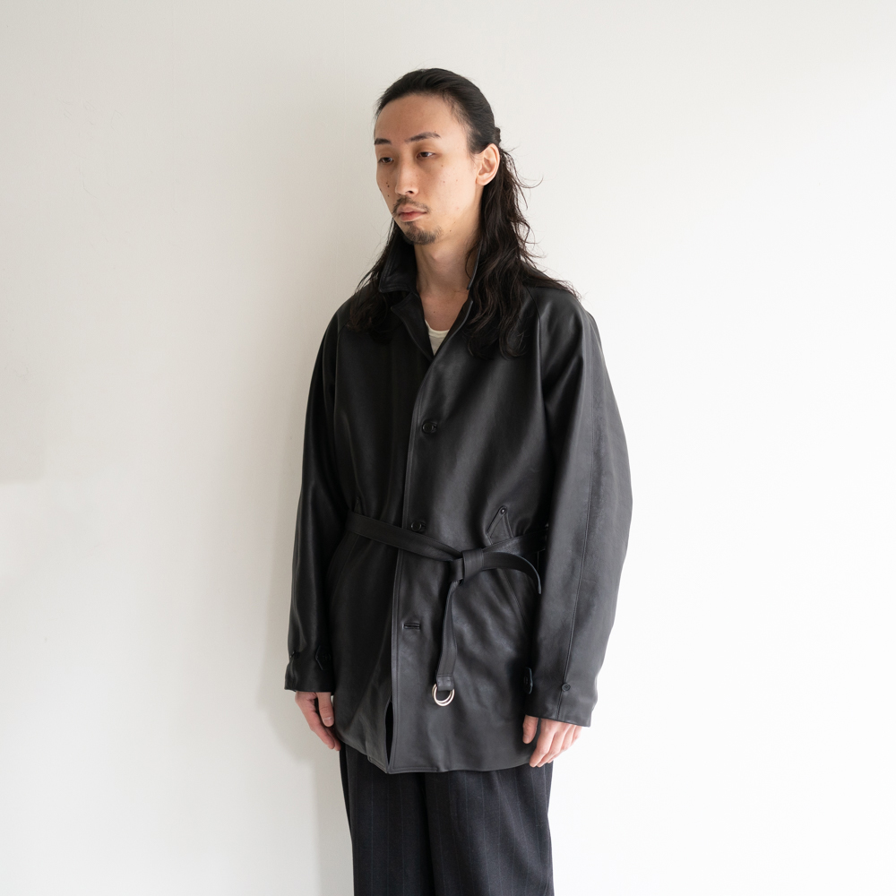 美しいアールを持つ襟からラペルにかけて滑らかに繋がるライン、ウエストのナローベルトなど